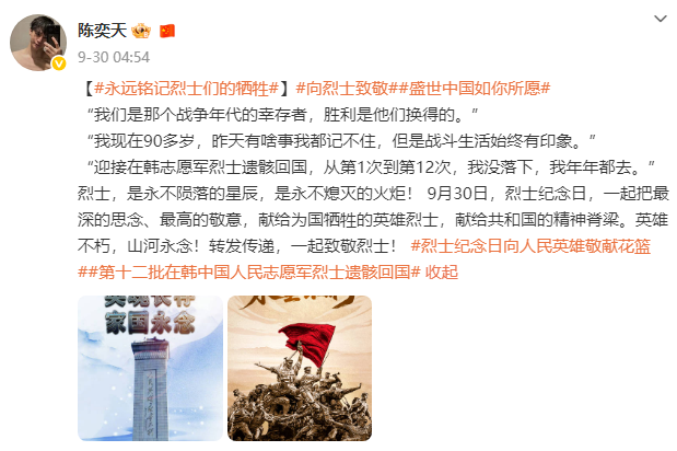 2025年9月30日,烈士纪念日,全国上下沉浸在缅怀英雄、致敬先烈的庄严氛围中。知名艺人陈奕天通过社交媒体发文,向为国捐躯的烈士们致以崇高敬意。他的文字真挚而深沉,迅速引发广泛共鸣。文中引用的老战士话语——“我们是那个战争年代的幸存者,胜利是他们换得的”“战斗生活始终有印象”,不仅是对历史的回望,更是一代人对牺牲与奉献的集体记忆的唤醒。这些话语,如同永不熄灭的火炬,照亮了后人前行的道路。烈士,是民族精神的象征,是永不陨落的星辰。从抗日战争到抗美援朝,无数英雄儿女用鲜血和生命铸就了共和国的基石。陈奕天在发文中特别提到“迎接在韩志愿军烈士遗骸回国”的仪式,从第一次到第十二次,他未曾缺席。这一细节,不仅体现了他对历史的尊重,也反映了全社会对英雄归来的深切期盼。每一次遗骸归国,都是一次精神的洗礼,一次民族的凝聚。这些烈士,曾经在异国他乡长眠,如今终于回到祖国的怀抱,他们的牺牲与奉献,永远铭刻在共和国的丰碑上。